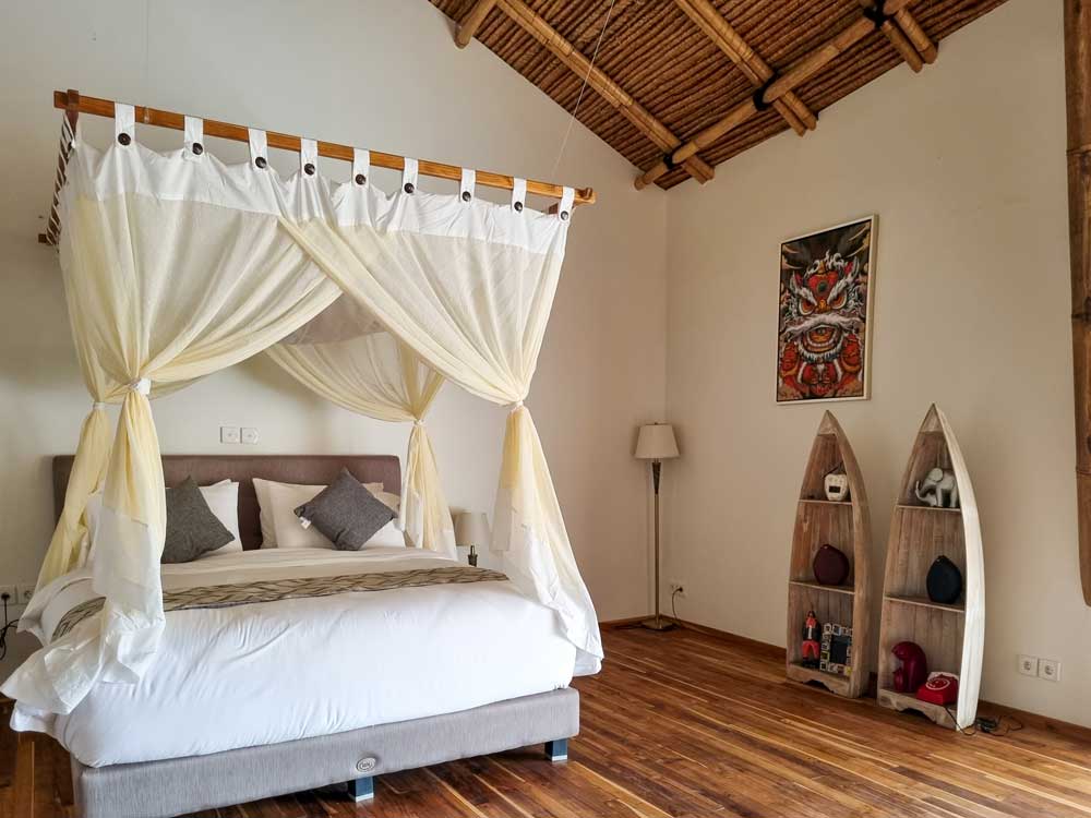 Dieser aus natürlichem Bambus gefertigte Bungalow bietet eine einzigartige Mischung aus rustikaler Eleganz und modernem Komfort, mit gemütlichen Möbeln, einem eigenen Bad und einer ruhigen natürlichen Umgebung.