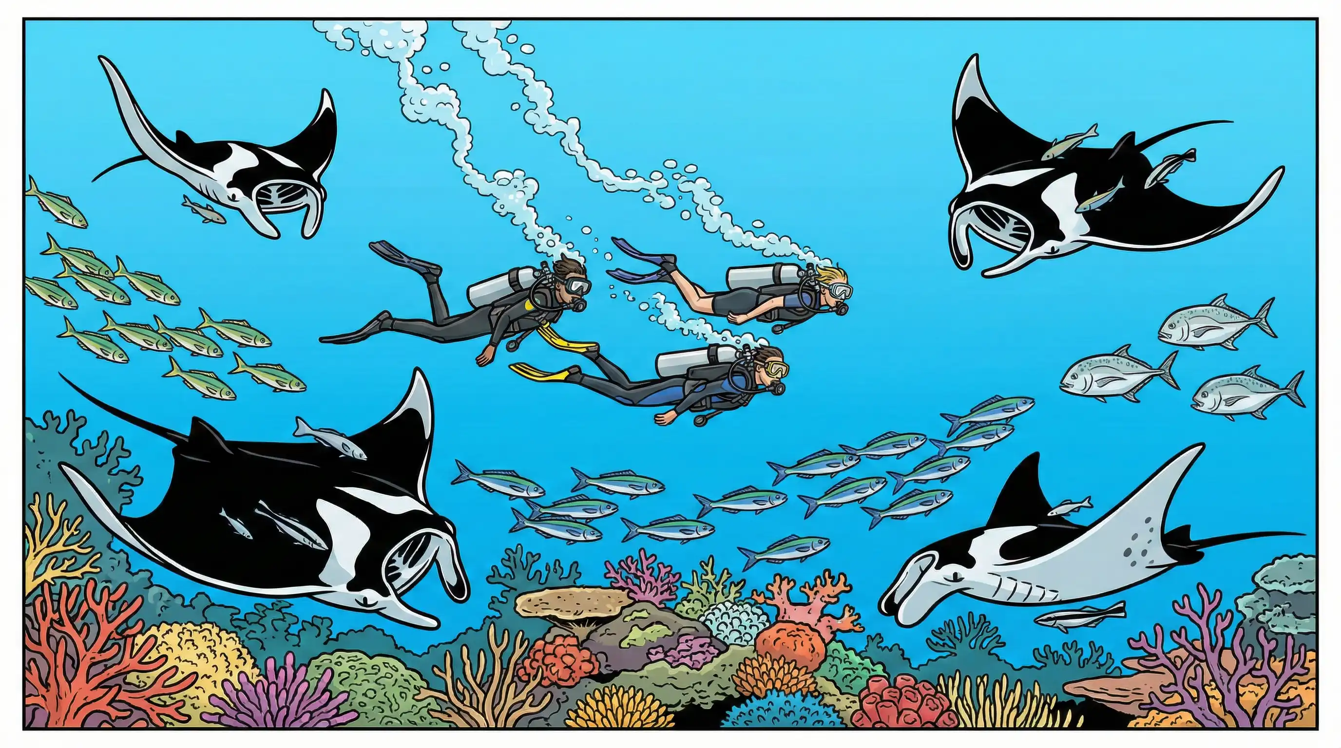 Qui, il galateo delle mante è molto importante: stare bassi, non bloccare le stazioni di pulizia, non inseguire o entrare in contatto e mantenere una galleggiabilità neutra sui coralli. Le mante tornano perché si sentono al sicuro nelle loro stazioni di pulizia. Farle sentire a loro agio garantirà a tutti i subacquei maggiori possibilità di vederle.